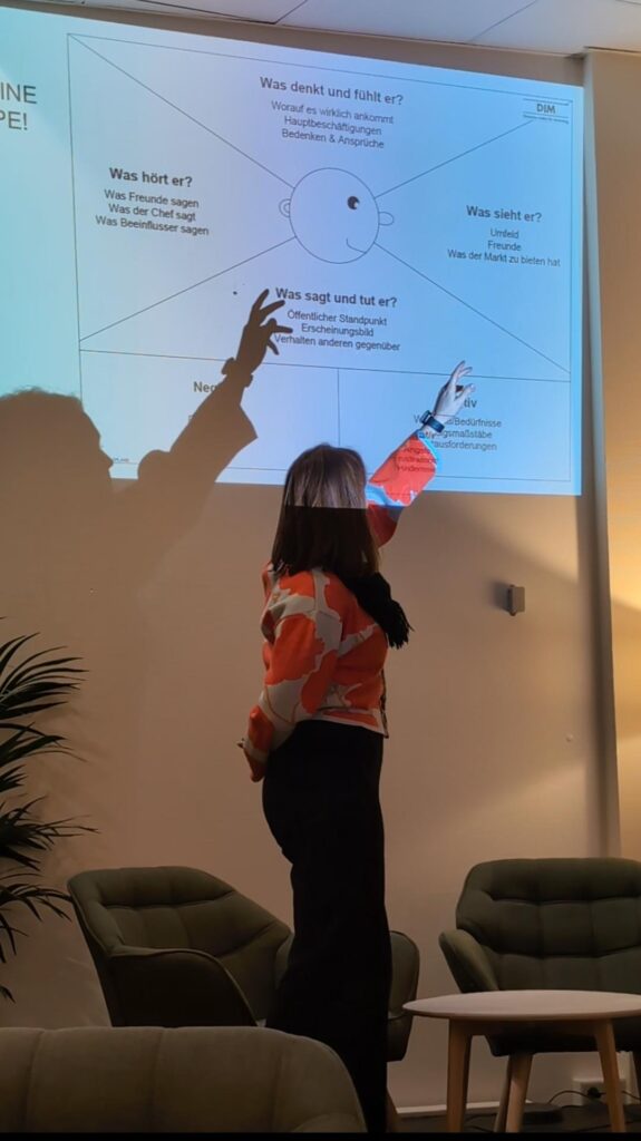 Der Workshop machte deutlich: Wer wirklich verstanden werden will, muss tiefer gehen. Wir haben Methoden wie die Empathy Map und die Erstellung von Personas eingesetzt, um uns in die Perspektive der Kund*innen hineinzuversetzen. Hypothesen wurden gebildet, getestet und angepasst – so entsteht ein echtes Verständnis statt bloßer Annahmen.